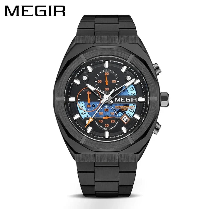 Megir 2225 Quartz Chronograph Black Dial Stainless Steel Chain Men’s watch